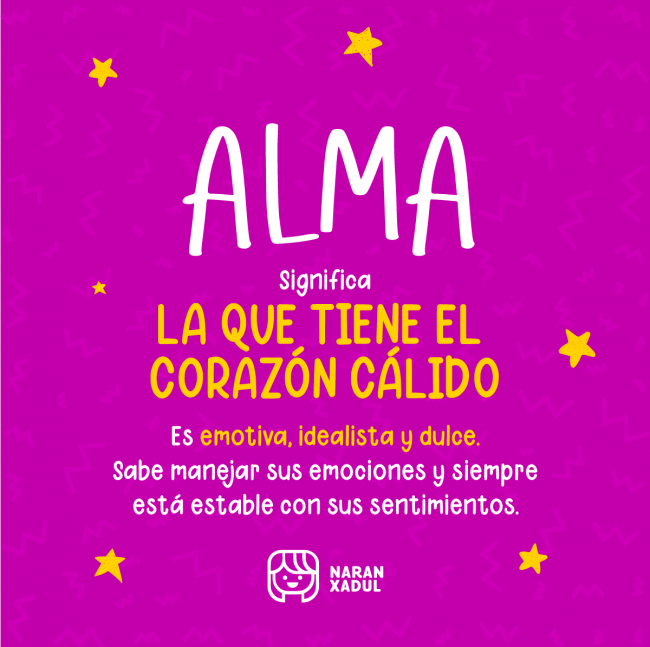 Alma es un nombre de origen latino. Procede de la palabra latina almus y su significado es De buen corazón o La que tiene el corazón cálido lo cual dice mucho de la personalidad que caracterizará a estas mujeres. Su significado es Que da vida. Para hacerlo automaticamente selecciona tu. El 25 de DICIEMBRE mes 12 de 1957 Suma. La dulzura es algo que caracteriza a las mujeres con el nombre de Alma tienen un agradable sentido del humor y siempre están dispuestas a luchar para ver a sus familiares felicesSuele afectarle las malas cosas que sucedes a su alrededor pero puede controlarse y mantenerse algo estable. Significado y origen del nombre ALMAConoces a alguien que se llama AlmaTe gusta Alma para tu bebéDe dónde proviene el nombre AlmaQué significa el nom. Por tanto el significado del nombre Alma es aquella que da vida. No dudes en consultar los comentarios de otras personas o compartir los suyos con nosotros aquí si tienes más información acerca de este nombre.